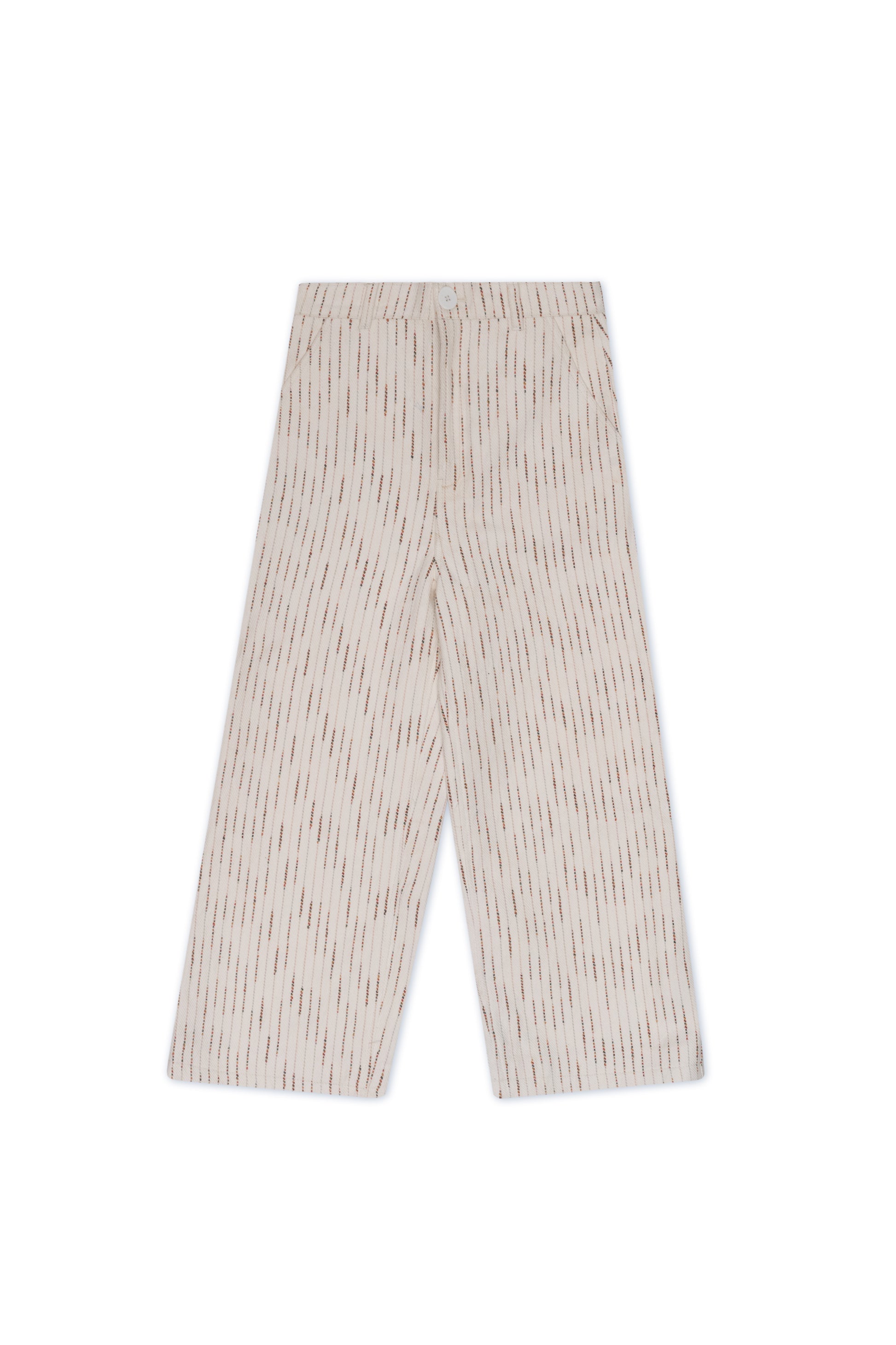Elevate your style with our stunning white pants, hand-woven with vibrant multi-color fancy yarn. The vertical stripes run down the grain, creating a dynamic and eye-catching effect.